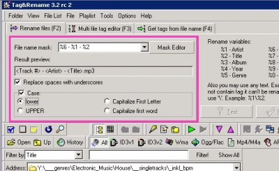 * Tag&Rename http://www.softpointer.com/ Shareware, Preis: USD 29.95 * mp3tag http://www.mp3tag.de/ Freeware