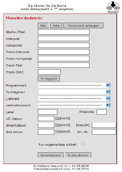 Am einfachsten schlägt man Infos über die ersten zwei Eingabefehlder nach: Stichwort/Titel, und Interpret. Andere Felder sind teilweise noch nicht mit Datenmaterial hinterlegt.